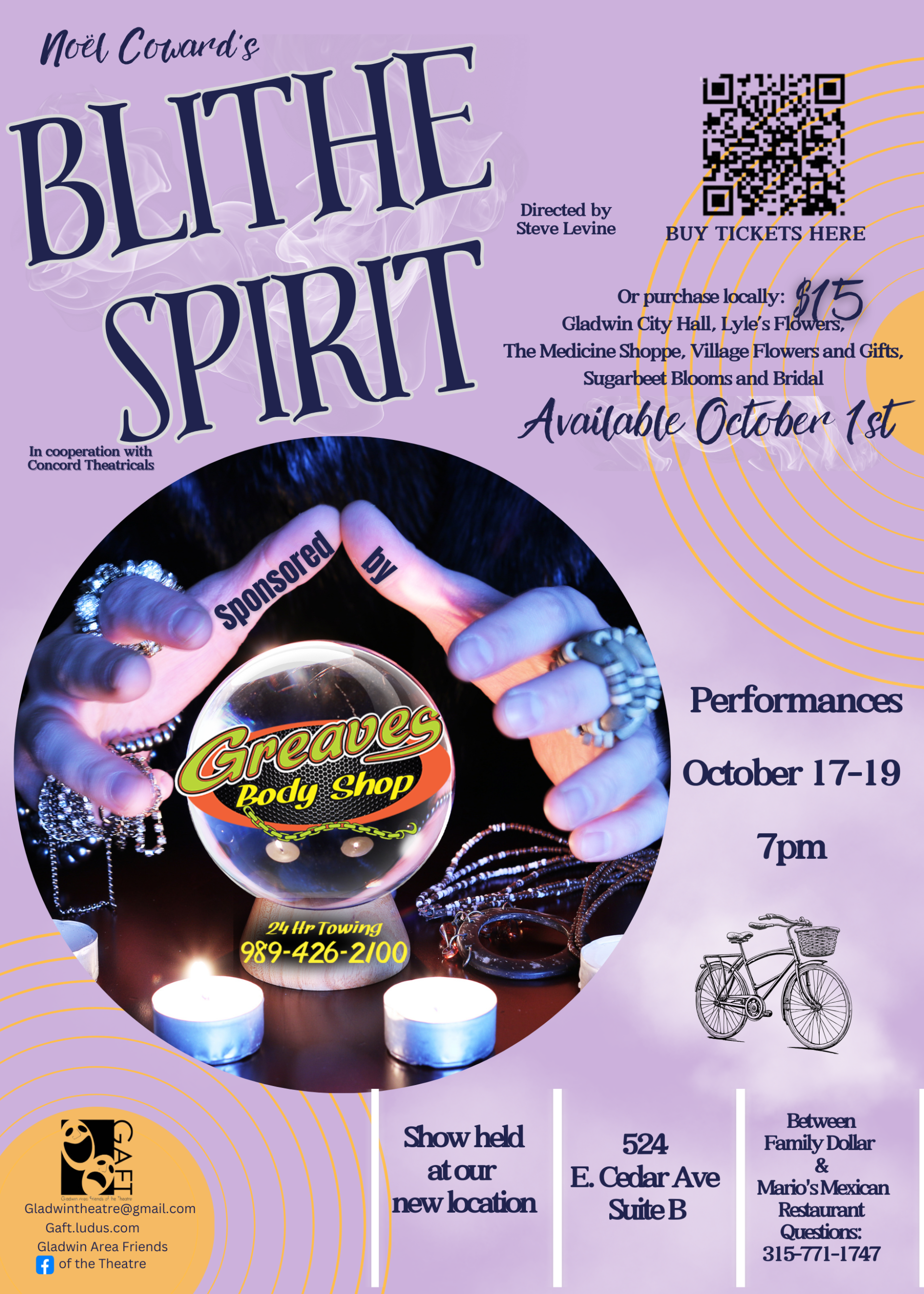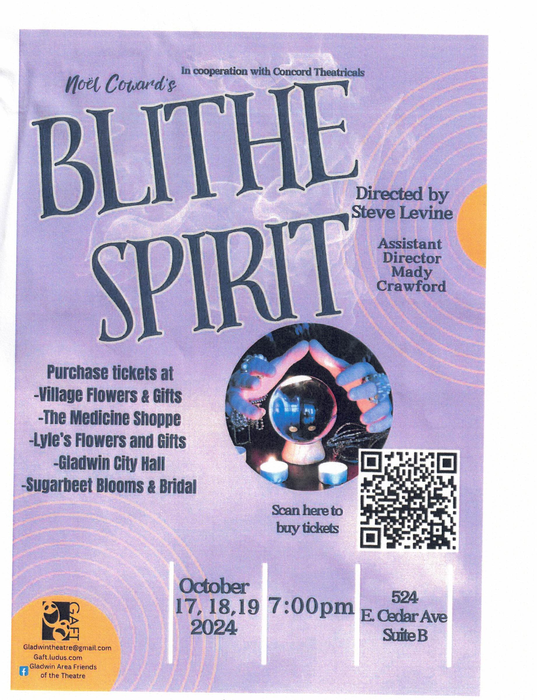 The Gladwin Area Friends of the Theater presents Noel Cowards classic Blithe Spirit. Sponsored in part by Greaves Auto Body and Towing.
