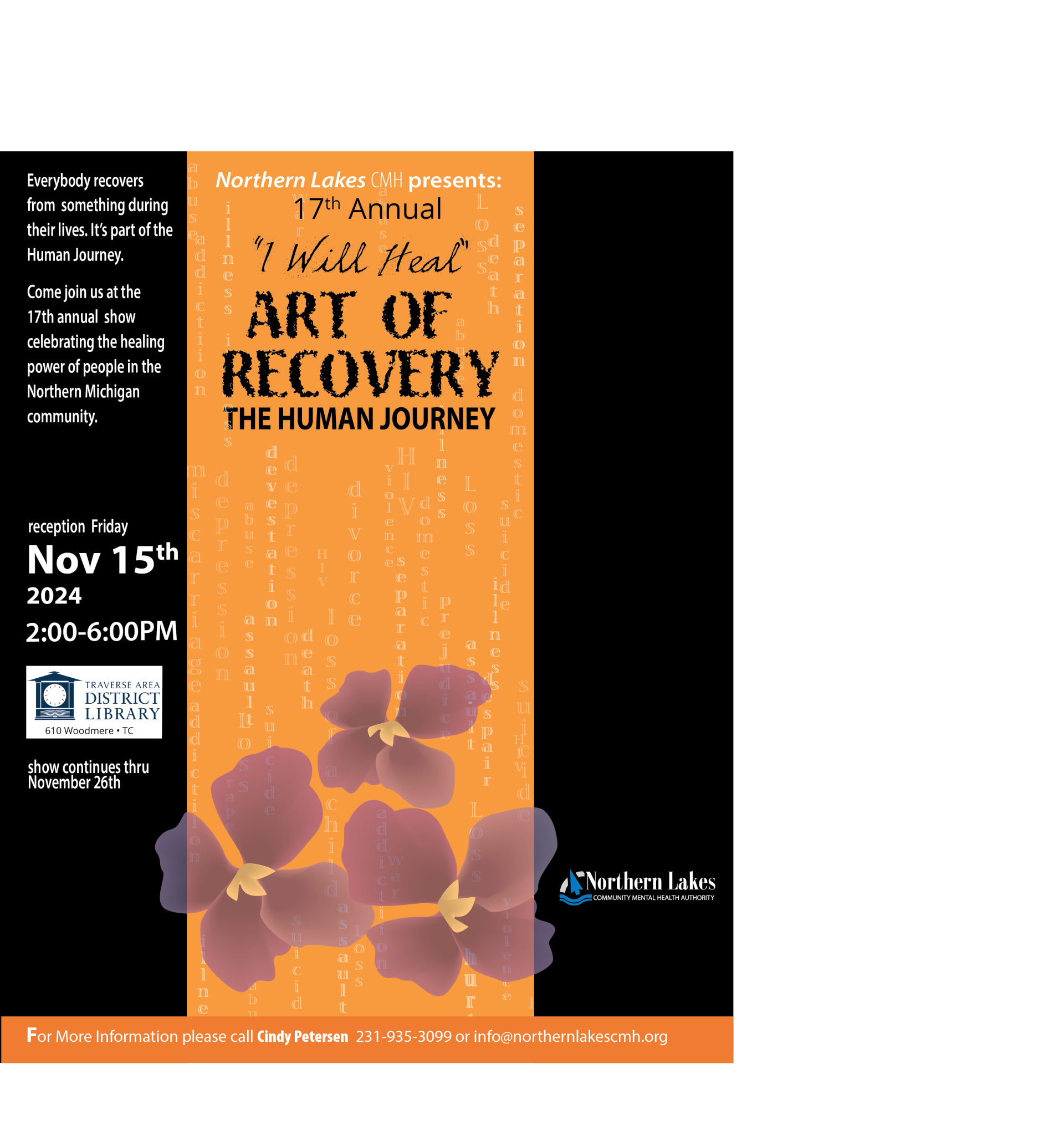 Northern Community Mental Health (NLCMH) is calling for entries for its 17th Annual Art of Recovery: The Human Journey show through Friday, October 25. Entries are open to anyone who is recovering or has recovered from anything who live in the six counties served by NLCMH: Crawford, Grand Traverse, Leelanau, Missaukee, Roscommon, Wexford. There is no cost to enter. The show is not a fundraiser. The purpose is Northern Community Mental Health (NLCMH) is calling for entries for its 17th Annual Art of Recovery: The Human Journey show through Friday, October 25. Entries are open to anyone who is recovering or has recovered from anything who live in the six counties served by NLCMH: Crawford, Grand Traverse, Leelanau, Missaukee, Roscommon, Wexford. There is no cost to enter.The show is not a fundraiser. Northern Community Mental Health (NLCMH) is calling for entries for its 17th Annual Art of Recovery: The Human Journey show through Friday, October 25. Entries are open to anyone who is recovering or has recovered from anything who live in the six counties served by NLCMH: Crawford, Grand Traverse, Leelanau, Missaukee, Roscommon, Wexford. There is no cost to enter. The show is not a fundraiser. The purpose is to celebrate the healing power and resilience of people, to combat stigma, and demonstrate that we are all in this human journey together. The show will be at the Traverse Area District Library November 8-26. A free, public reception will be held on Friday, November 15, from 2:00 to 6:00 p.m.
